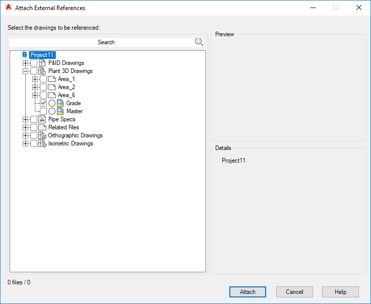 A drawing file that contains plant objects (P&ID or 3D Model) must belong to exactly one project. Also, any external references that contain plant objects must belong to the current project. This is required to support the plant project database and the Data Manager.