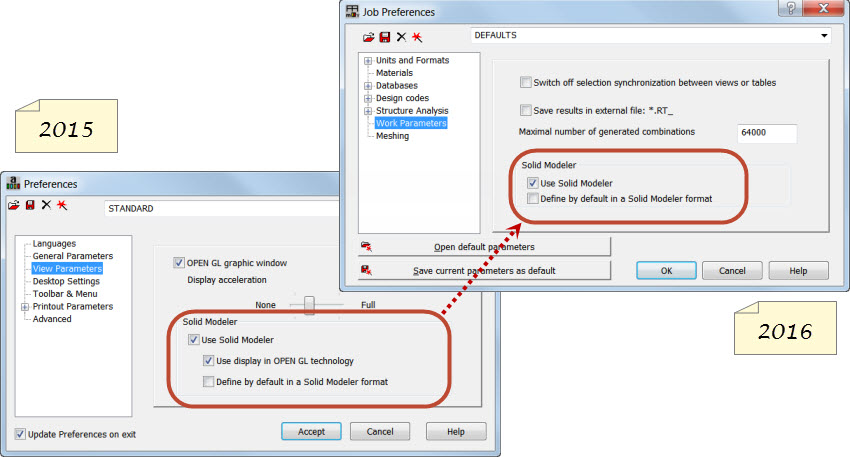 The solid modeler settings, which were located in the Preferences - View parameters dialog, have been moved to the Job Preferences - Work Parameters dialog.