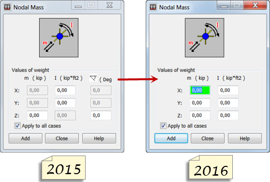 The global direction rotations by angle have been removed from the Nodal Mass dialog. From now on, the nodal mass direction is defined by global directions only.
