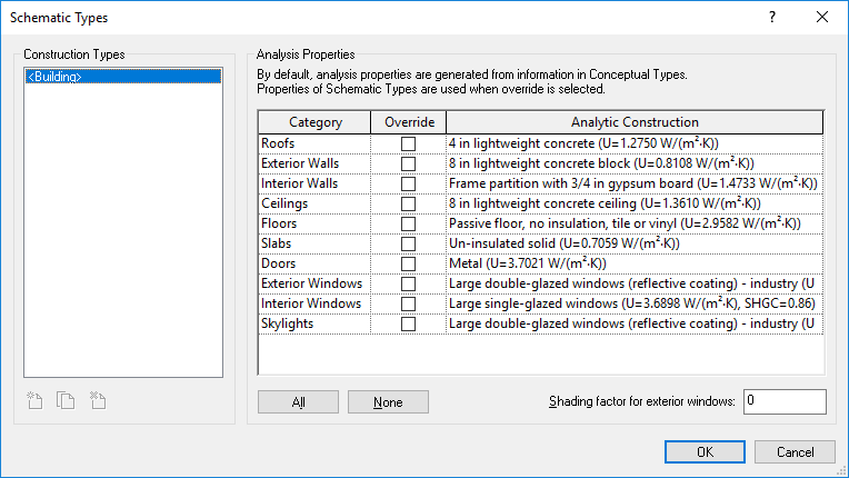 When you next perform energy analysis, thermal properties for the specified schematic types (analytic constructions) are used for those element categories.