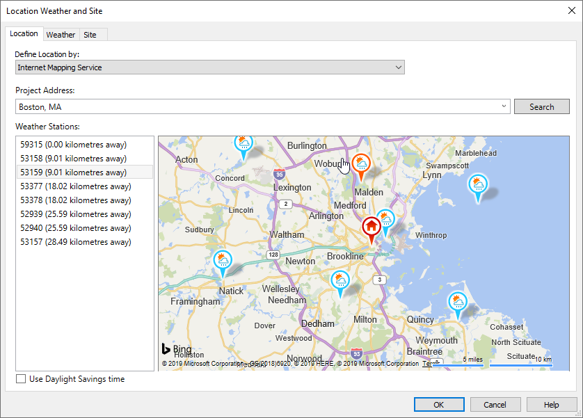 Available weather stations display in the map and in the left-hand list. In general, you should choose a weather station nearest to your location. However, you may want to choose a nearby weather station whose elevation and land or water features better reflect the model's location.