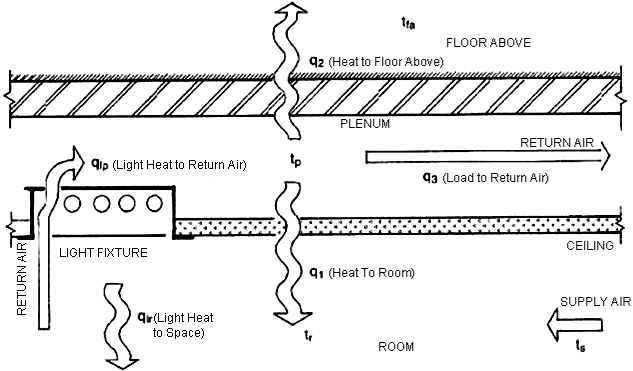 The space above a ceiling, when used as a return air path, is a ceiling return air plenum. Unlike a traditional ducted return, the plenum may have multiple heat sources in the path. These heat sources may be radiant and convective loads from lighting and transformers; conduction loads from adjacent walls, roofs, or glazing; or duct and piping systems within the plenum.