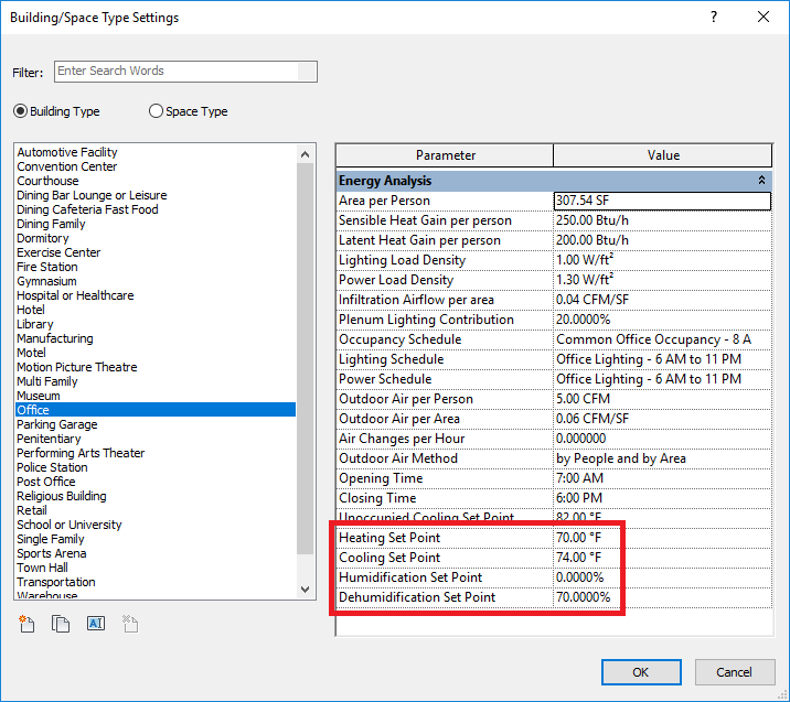 The set points may be overridden by using a Space in the same location as the analytical space. The values in the Space Type settings will be applied to the analytical space.