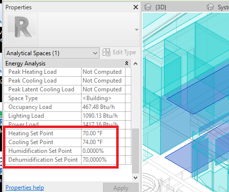 After creating the energy model, the set points in the Building Type settings are applied to the analytical spaces and display as read-only in the Properties palette.