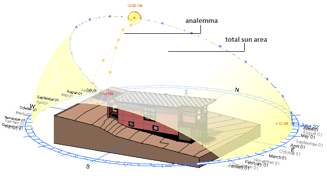 | Analemma | The figure-8-shaped path that represents the position of the sun in the sky at the same time every day over the course of a year. Visible in Still, Single Day, and Multi-Day modes. | Drag the sun perpendicular to the daily path and along the analemma to change the date. |