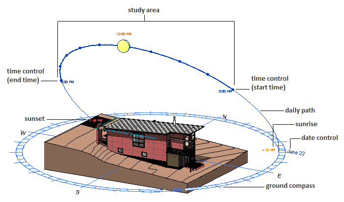 | Daily path | The arced path the sun follows across the sky for the specified day. Visible in Still, Single Day, and Multi-Day modes. | Still and Single Day: Drag the sun along the daily path to change the time, or drag the daily path itself to change the date. Multi-Day: Drag either daily path to change the start or end date of the study. |