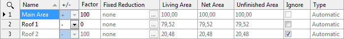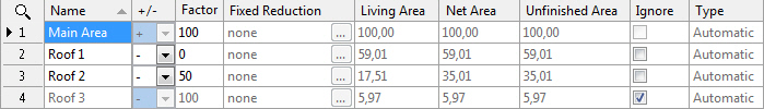 - Roof 3: This reports subarea data for the area above 2.00 m height line. The area is added to the living area. This area has been set to Ignore by default and thus read-only in this dialog. So, the subarea value is subtracted from the main area and the result is correctly calculated in the room tag. When you summarize the net room area of the subareas, you can see that the result of the NRA corresponds to the main area.