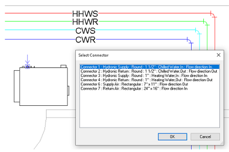 If the new component could be connected to more than one system, the Select Connector dialog opens. Each piping connector is listed with its index number, System Classification, shape, size, Connector Description, and flow direction. The Connector Description may be used to indicate the System Type that should be assigned to the connector. An arrow shows the location and direction of the selected connector.
