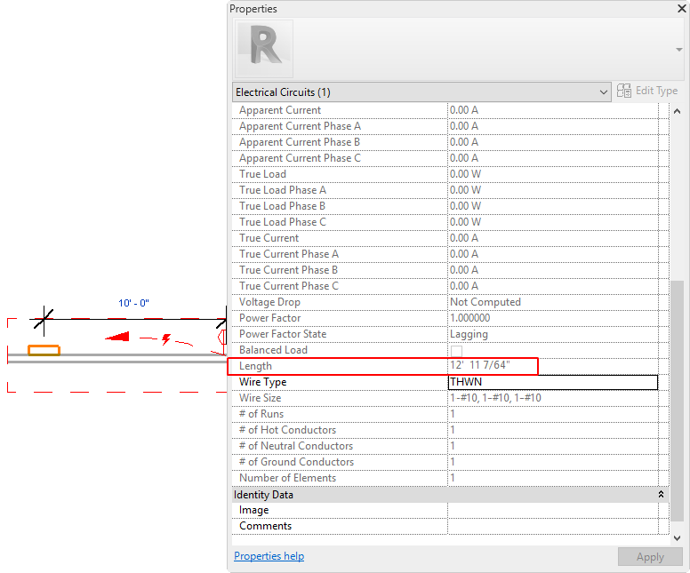 The overall length of wiring in a circuit is calculated and displayed as the value for Length in the Properties palette.