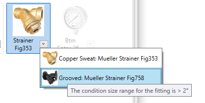 When you click the arrow, a drop-down list displays additional parts based on the size. This drop-down list is controlled by the conditions in the service definition, similar to routing preferences. For example, a bend may use a pressed bend up to a certain size, and a segmented bend above that size. When you place the cursor over a part in the list, a tooltip displays the size range based on the condition for that part.