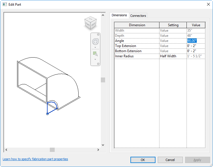 Edit a fabrication part in Revit to define the necessary dimensional values and connector settings.