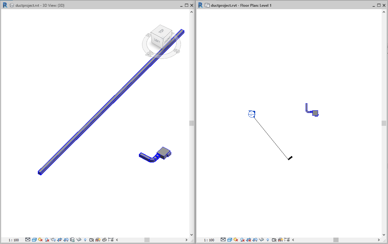 The associated 3D view shows how the ductwork is actually created. The resulting ductwork is drawn with a vertical segment and a horizontal segment to connect to the ductwork on level 2. The horizontal segment is added perpendicular to the section view plane.