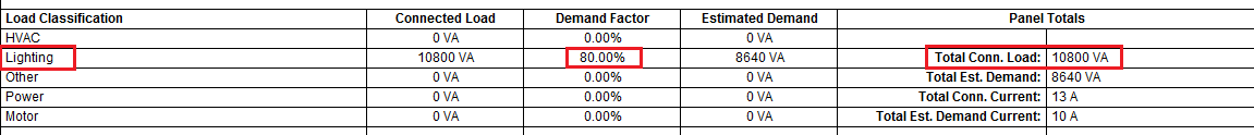 The lighting demand factor has been specified as calculated by load with the total calculation at one percentage. If the Load is greater than 10000VA, the demand factor is 80%.