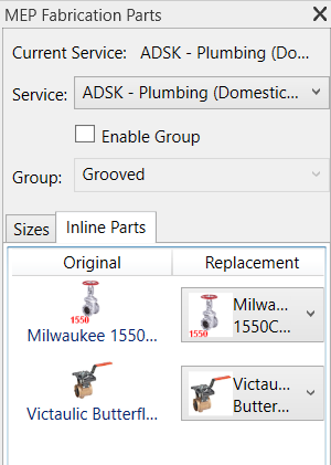 - To select a different group of fittings, click Enable Group and select a Group from the drop-down. For example, for ductwork, you might want to change the Group from the Rectangular to Round Bought Out.
