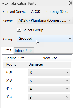Note: Changing the size can impact the type of fitting used. If the Inline Parts tab displays a red exclamation mark, you must select a replacement fitting for one or more of the original parts.