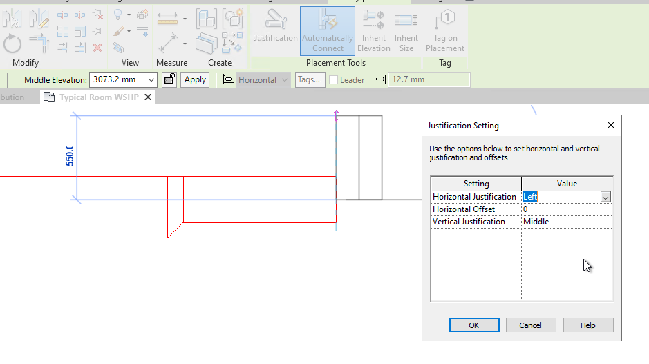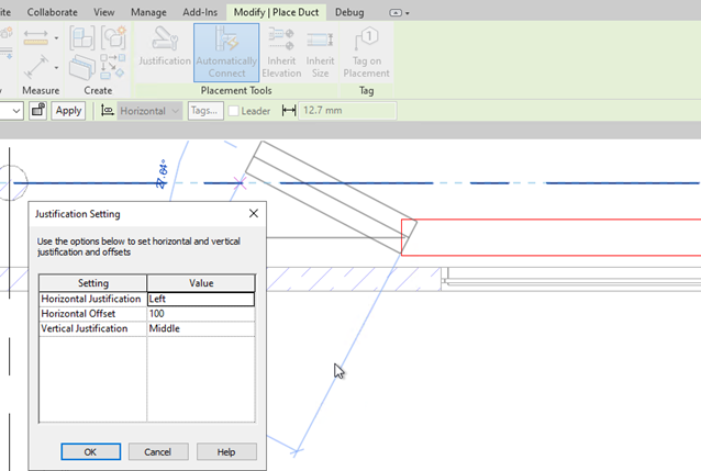 Justification Settings while the Duct tool is selected. You can specify the following justification layout options.