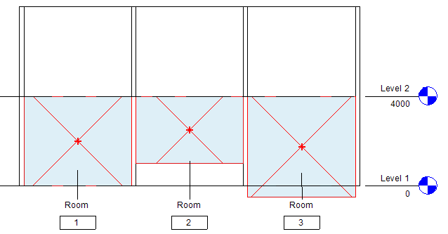A positive value for a base offset can only be used when the computation height of the room's associated level also has a positive value. The base offset of the room can not exceed the computation height of the associated level. For example in the example above, the base offset of Room 2 is 1000. The computation height of level 1 must be 1000 or greater for this to be possible.