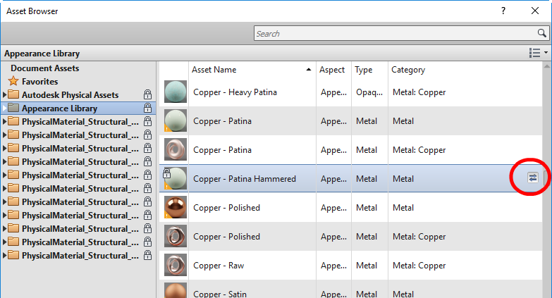 - Click the tab for the asset to replace (for example, Appearance, Physical or Thermal), and then click the Replace Asset button