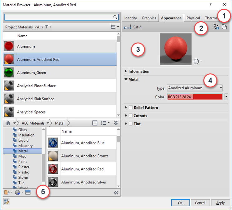 | 4 | Properties panel: Display and manage detailed properties of the selected asset. The asset name and description are displayed beneath the Information drop-down panel. This example above shows the Metal properties being displayed (expanded) for the "Anodized - Red" Appearance asset. The set of properties that are displayed for a liquid, for example, differ from the set of properties displayed for metal. |
