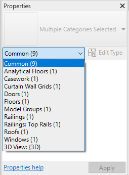 Immediately below the Type Selector is a filter that identifies the category of the elements a tool will place, or the category and number of elements selected in the drawing area. If multiple categories or types are selected, only the instance properties common to all display on the palette. When multiple categories are selected, use the filter’s drop-down to view only the properties for a specific category or for the view itself. Selecting a specific category does not affect the overall selection set.