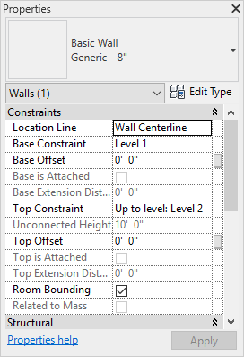 In most cases (see exceptions in note below), the Properties palette displays both user-editable and read-only (shaded) instance properties. A property may be read-only because its value is calculated or assigned automatically by the software, or because it depends on the setting of another property. For example, a wall’s Unconnected Height property is only editable if the value of its Top Constraint property is Unconnected. For specific dependencies, see the instance property descriptions for individual element types.