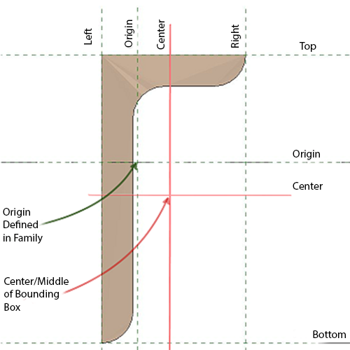 The following illustration shows the difference between the origin of the family geometry as opposed to the center of the bounding box.
