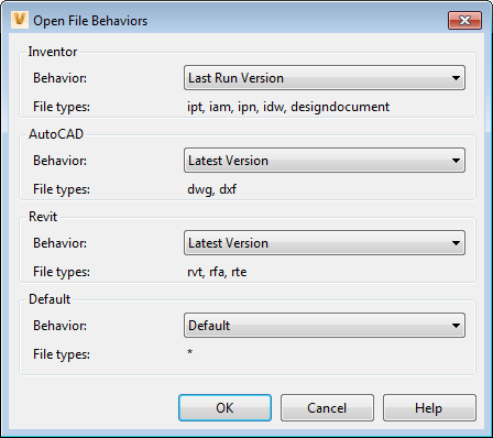 - Lets you determine whether Inventor, AutoCAD, and Revit files are opened by the latest version, the last run version, or the version of the CAD application that saved the file.