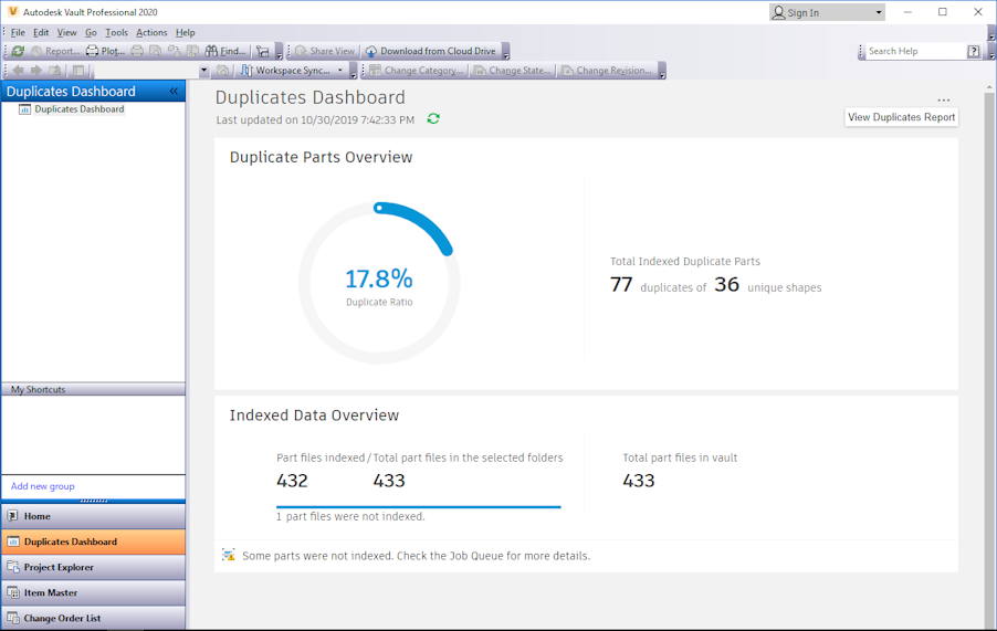 After the files are indexed, you can view the data in the Duplicates Dashboard. In Vault Client, click Duplicates Dashboard. You can view the duplicate parts report which can also be exported to Excel, PDF or Word format.
