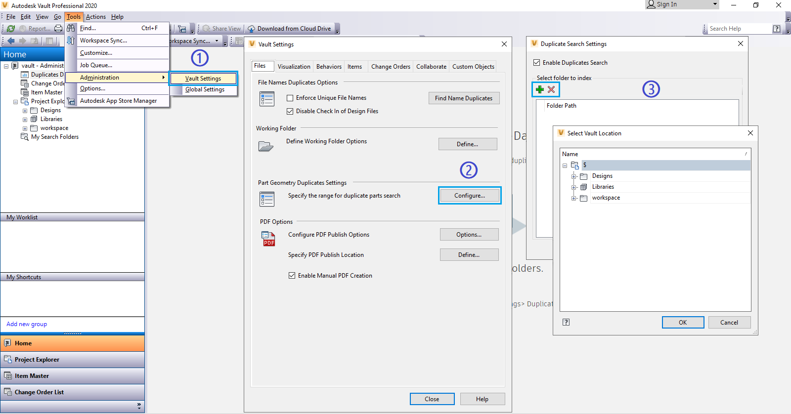 In the Vault Settings dialog box, define the search range. Specify folders where parts will be indexed.