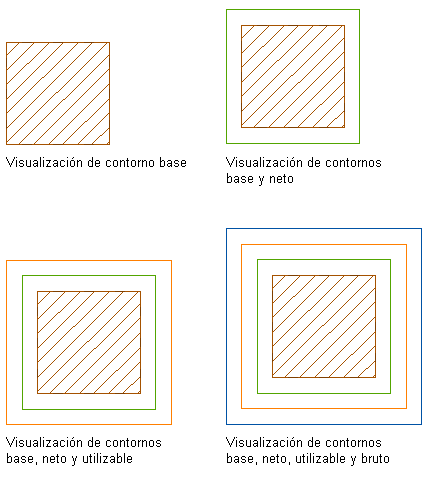 Los espacios tienen cuatro contornos. Puede utilizarlos para visualizar, editar y planificar distintos aspectos del espacio. Puede configurar estos contornos para que no se desfasen entre sí, y que se mantengan unos encima de otros. Si no necesita diferentes contornos, puede desactivar los componentes de visualización de los contornos adicionales. A continuación, se incluyen algunos casos típicos de uso de contornos individuales: