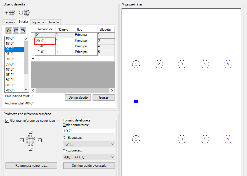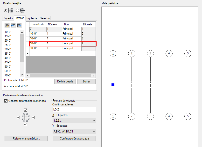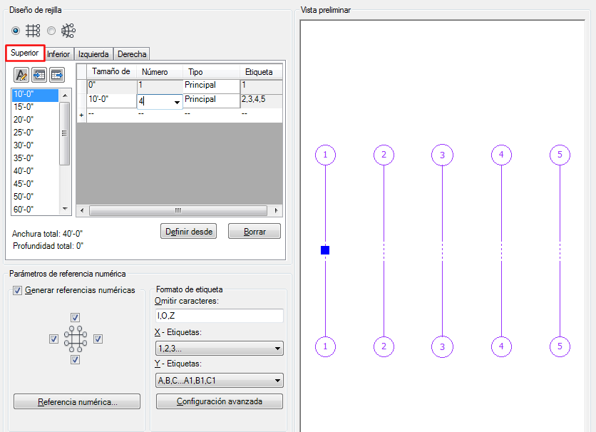 De este modo, el primer hueco se extiende dos huecos hacia la parte inferior, obteniendo cuatro líneas de rejilla, en lugar de cinco. Ahora puede pasar a la ficha Izquierda para editar el otro eje de la rejilla o bien pulsar Intro para colocar la rejilla en el dibujo.