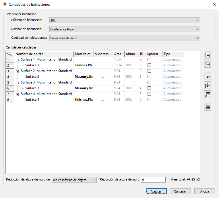 El material del objeto principal se transfieren a todas las caras y subáreas detectadas automáticamente. Por ejemplo, un objeto de muro tiene material de superficie Enlucido. Existen dos ventanas en el muro que se detectan automáticamente como subáreas y se sustraen del área del objeto principal. Para reducir el material de enlucido de la superficie principal correctamente por el área de ventana sustraída, la subárea obtiene automáticamente el mismo material que el área principal con el signo menos de cálculo.