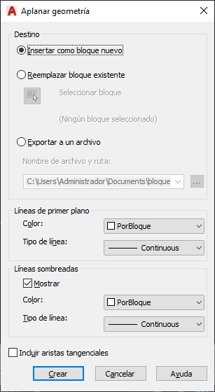 Precisa que la representación aplanada se inserte como un bloque en el dibujo actual.