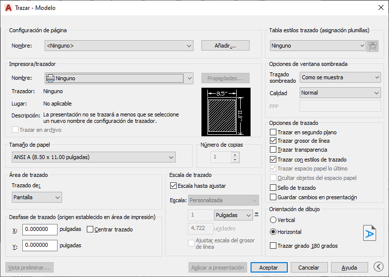3. Seleccione el tamaño de papel, el área de trazado, la escala de impresión, la orientación y otras opciones.