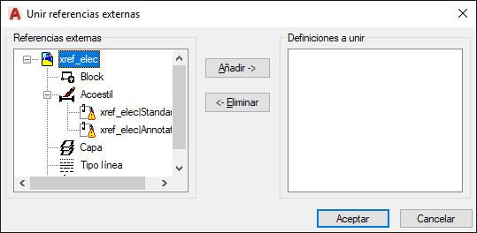 Fusiona en el dibujo actual objetos guardados dependientes de referencias externas (como bloques, estilos de cota, capas, tipos de línea y estilos de texto).