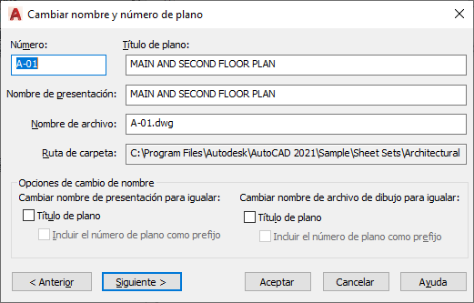 Carga el siguiente plano en este cuadro de diálogo. Esto proporciona un método sencillo para cambiar el número o el título de una serie de planos.