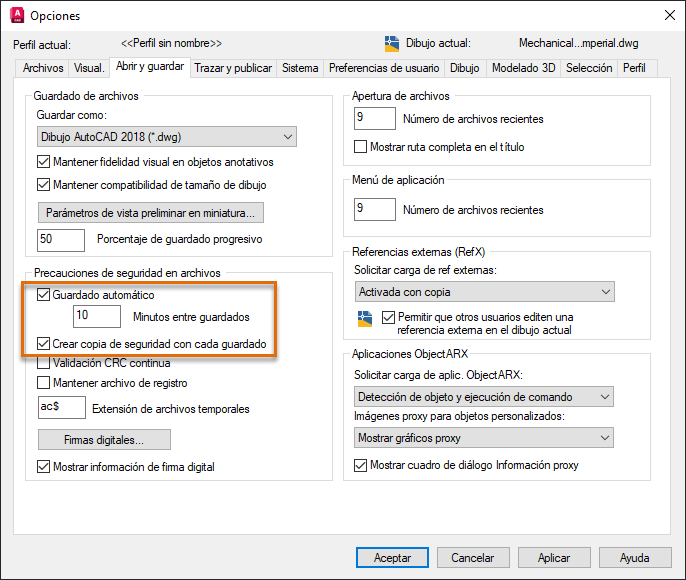 Copia de seguridad y guardado automático de archivos de dibujo