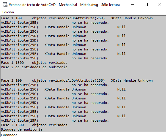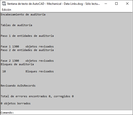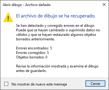 Si el dibujo que ha abierto contiene errores, el número de errores detectados y corregidos se muestra junto con el número de objetos borrados debido a que no se han podido corregir.