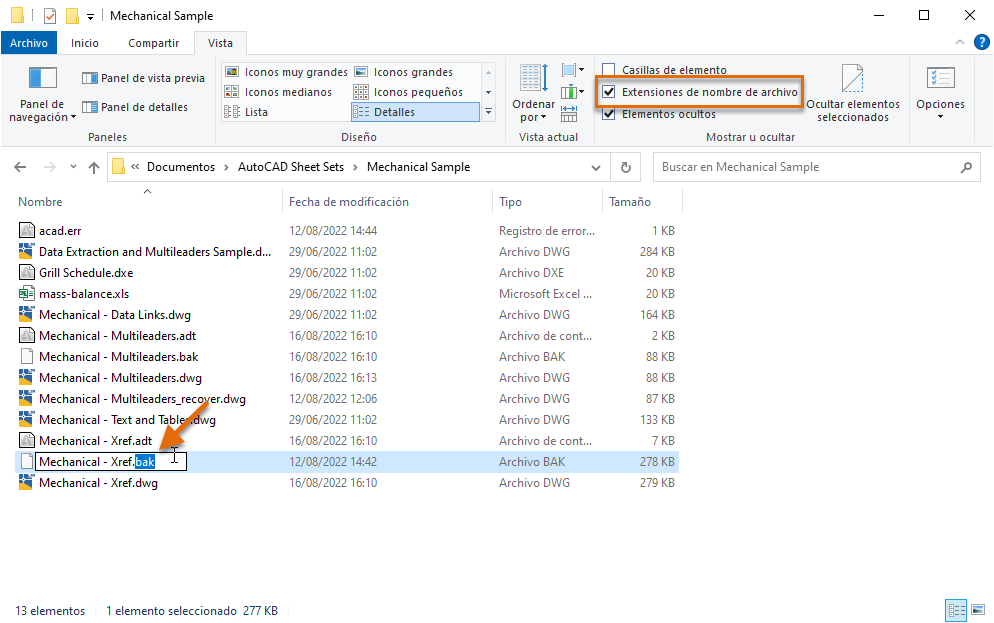 Resalte la extensión bak o sv$ y, a continuación, escriba dwg.