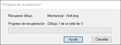 Aparece el cuadro de mensaje Progreso de recuperación, que le informa del progreso de la revisión de los archivos de refX enlazados al dibujo.