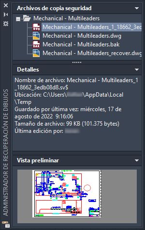 Consejo: Los archivos BAK y SV$ también se pueden renombrar y abrir fuera del Administrador de recuperación de dibujos. Consulte la sección Copia de seguridad y guardado automático de archivos de dibujo mostrada anteriormente en este tema.