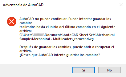 Aunque esperamos que nunca le ocurra, es posible que AutoCAD encuentre un problema y se cierre de forma inesperada. En ese caso, se le solicitará que guarde cada dibujo abierto que tenga cambios sin guardar. A estos dibujos, se les añadirá "_recover" a sus nombres para garantizar que no se sobrescriba el archivo de dibujo guardado anteriormente.