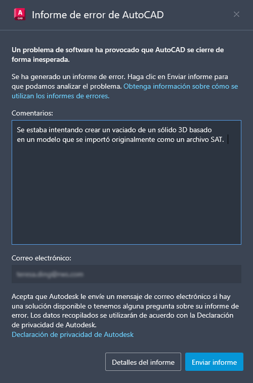 A continuación, se muestra el cuadro de diálogo Informe de error de AutoCAD con información opcional introducida: