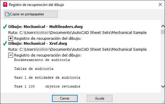En el cuadro de mensaje Registro de recuperación del dibujo, consulte el informe de resumen de revisión del dibujo y sus refX enlazadas. Haga clic en Cerrar para cerrar el cuadro de mensaje.