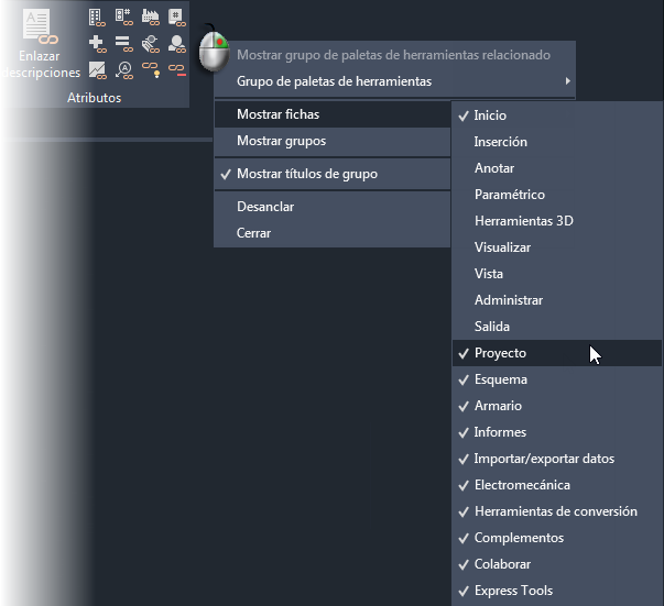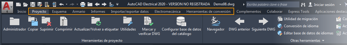 conjunto de herramientas AutoCAD Electrical incluye una cinta de opciones estándar con fichas en la parte superior del área de dibujo. Las fichas específicas de conjunto de herramientas AutoCAD Electrical se incluyen junto con las fichas de la cinta de opciones de AutoCAD.