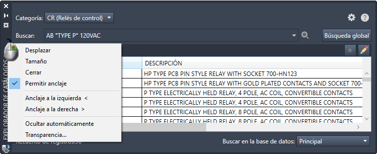 conjunto de herramientas AutoCAD Electrical utiliza paletas para administrar los proyectos y trabajar con la base de datos de catálogo. Una paleta puede permanecer en la pantalla mientras se utilizan otros comandos. De este modo, está accesible siempre que la necesita.