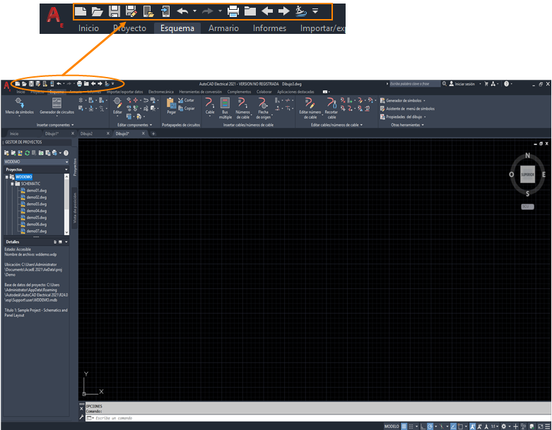 Puede acceder a todas las funciones que se muestran en esta guía desde la cinta de opciones. Además, la barra de herramientas de acceso rápido que se muestra incluye algunos comandos de navegación utilizados en conjunto de herramientas AutoCAD Electrical.