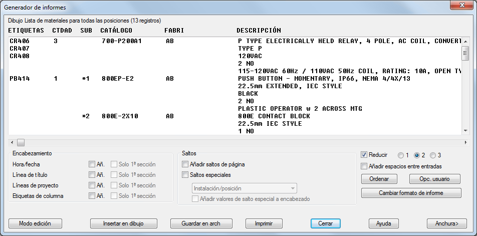 conjunto de herramientas AutoCAD Electrical presenta varios informes para elegir. Algunos informes contienen información extraída solamente de los dibujos de esquema, mientras que otros informes contienen información únicamente de los dibujos de implantación física. También puede crear un informe de lista de materiales completo que contenga todos los elementos de armario y los elementos de esquema que no se muestran en las implantaciones físicas.