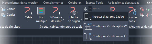 Después de definir el formato del sistema de referencia, el diagrama Ladder, la rejilla XY o la zona X se podrán insertar en un dibujo. Busque los comandos en la ficha Esquema
