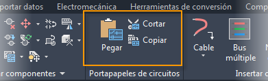 Los comandos Copiar o Cortar insertan los componentes y cables en el portapapeles de circuitos. Utilice el comando Pegar para insertar los objetos en el dibujo activo o en otro dibujo. Es posible que sea necesario actualizar los números de borna, ya que este comando no permiten incrementar los números de borna.